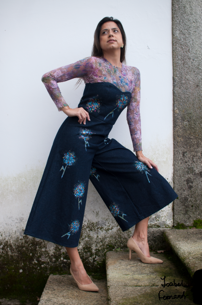 Dreaming Flowers’ is the result of the union between the strength of denim and the delicacy of hand-painted lace. Inspired by Kandinsky’s vibrant palettes, this jumpsuit is a celebration of individuality and creativity. Each piece is unique, just like the brushstrokes that make it up.